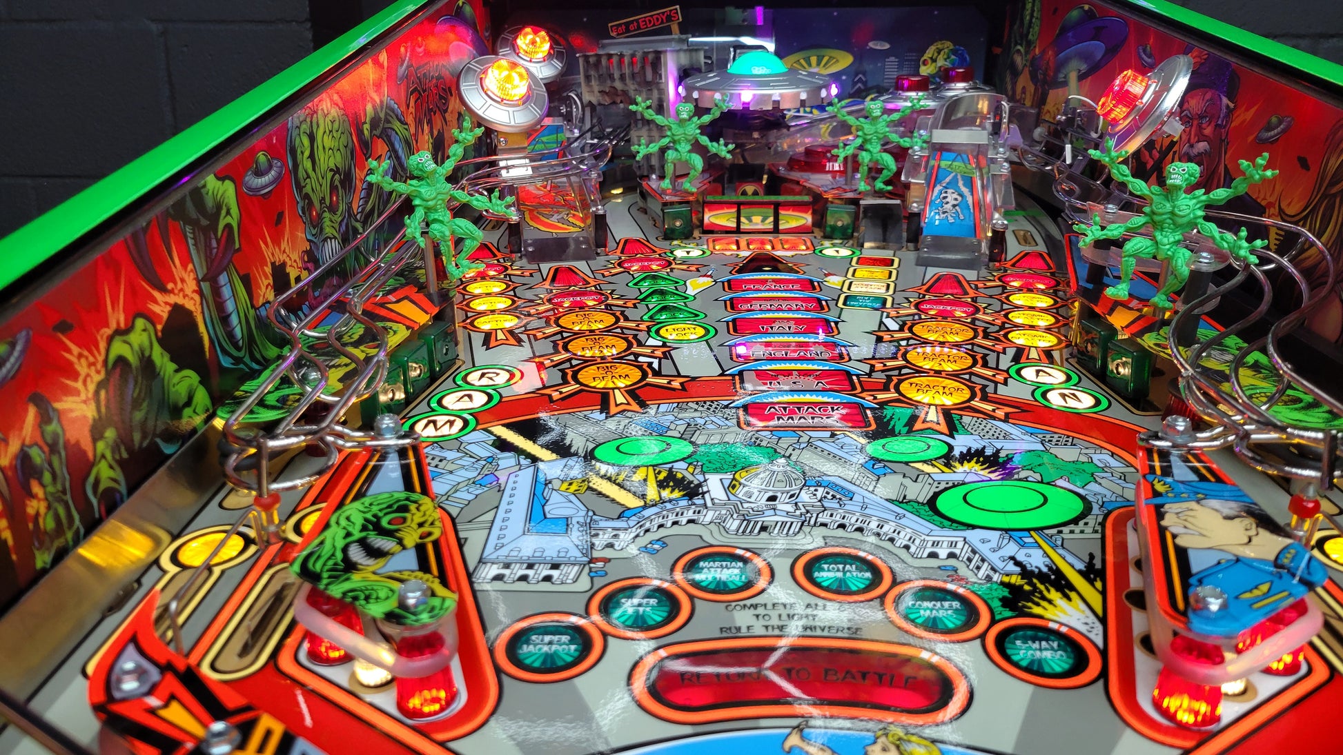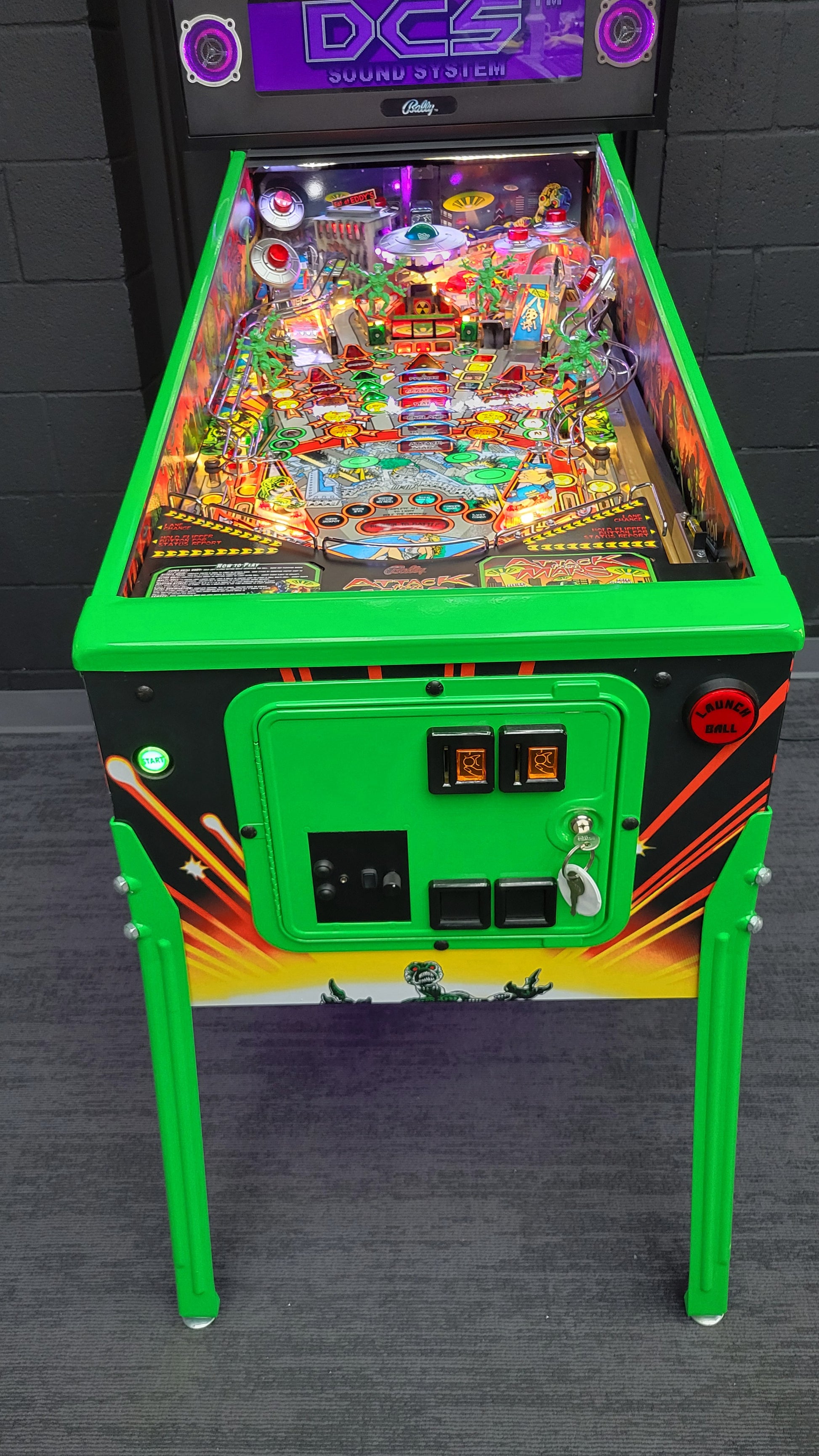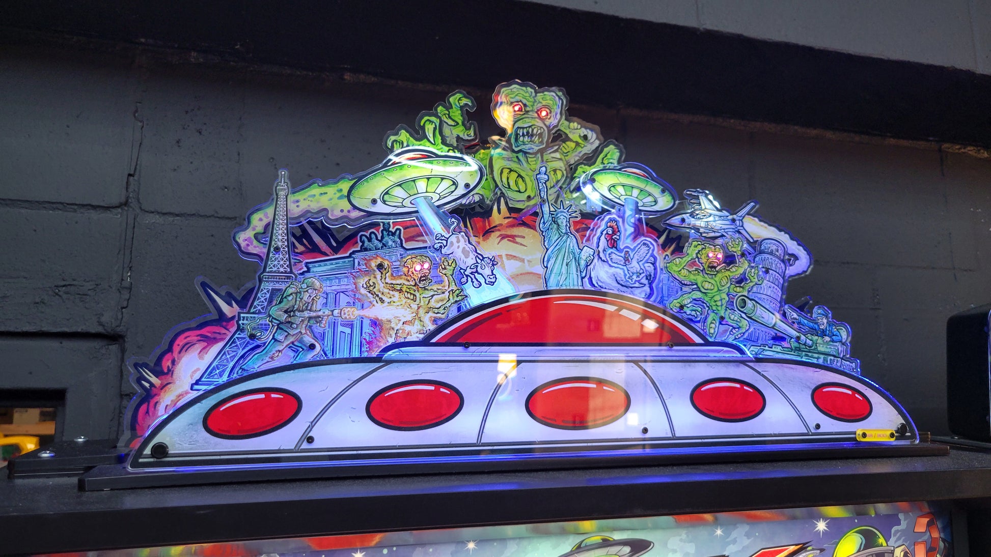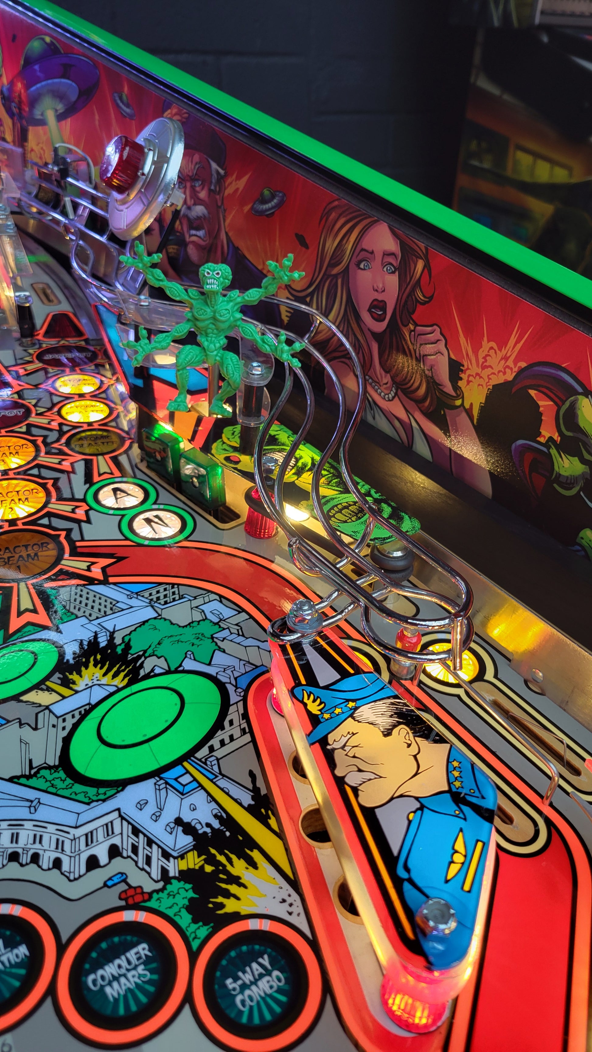 You get Flyland Design custom translite (original translite also included) green powder coated armor and coindoor, a beautiful Electric Playground topper valued at $1300 with an animated ufo and alien that move with the pinball action, a building mod, art blades and more...