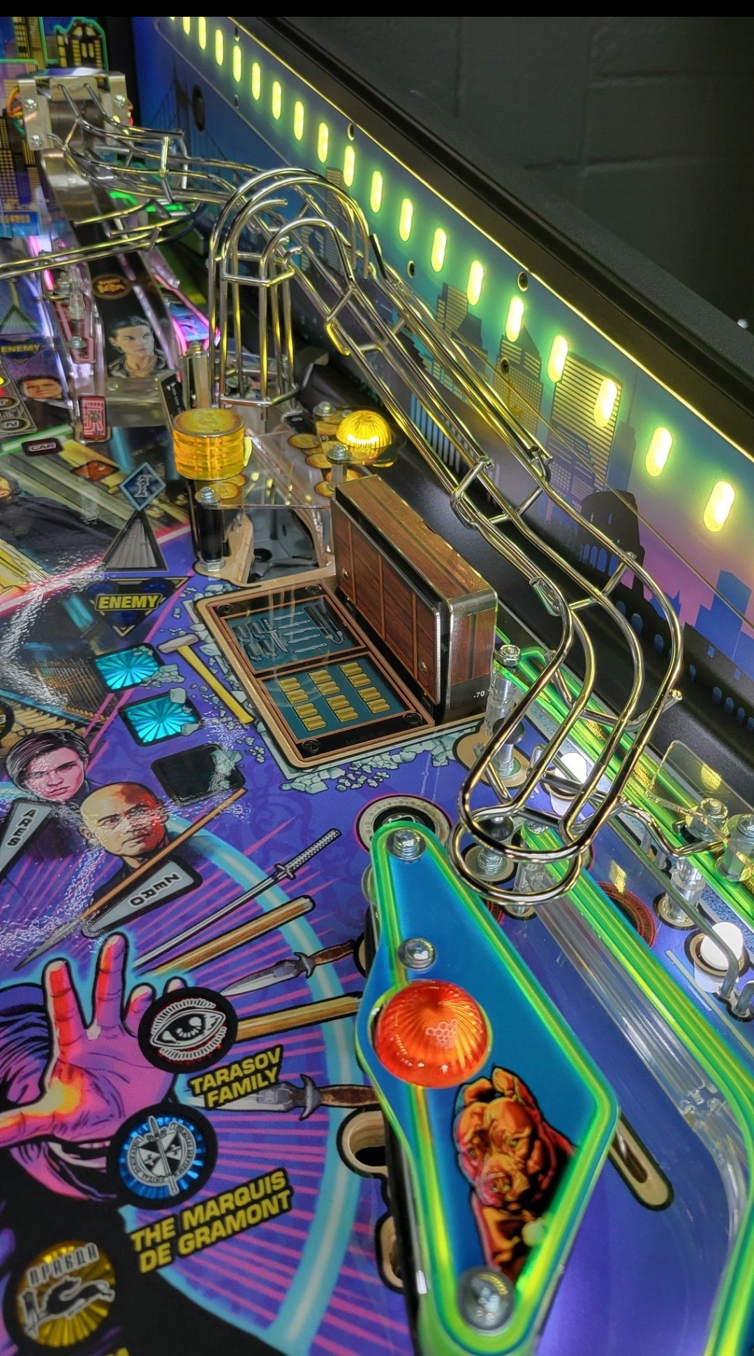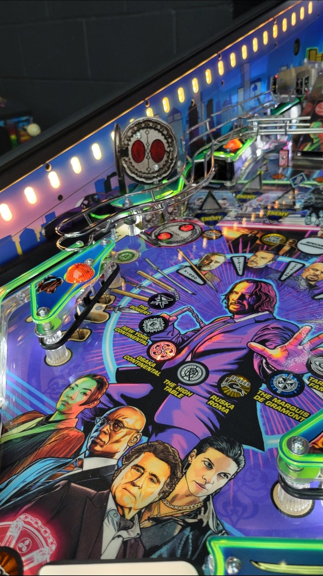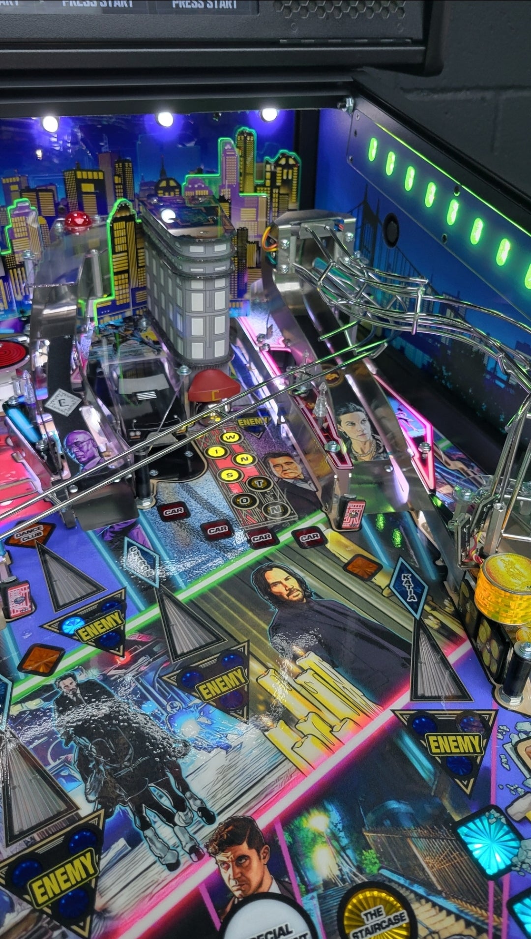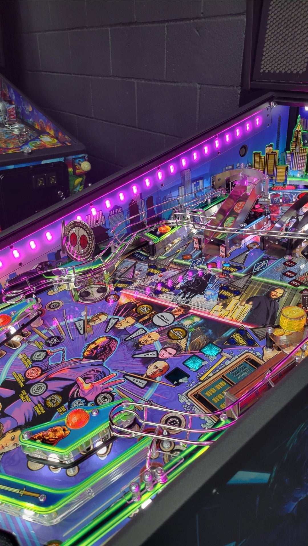 To raise the stakes, John Wick pinball introduces Stern’s all-new dynamic AI combat system, an innovation that brings the frenetic combat of the legendary films to the game. The Stern team has created a primitive video game AI system to control the enemy lights on the playfield, setting the John Wick pinball games apart from prior pinball machines, where all lights were controlled by player actions, timers, and random number generations. In this new AI combat system, enemy icons are responsive to player behavior and will illuminate dynamically around the playfield to challenge the player. The enemies move tactically with this dynamic software to counter player objectives, creating a unique challenge in each game session. The system also features a new action video player that dynamically reflects player action – as you defeat three enemies, you’ll see video clips of John Wick doing the same in the films!
