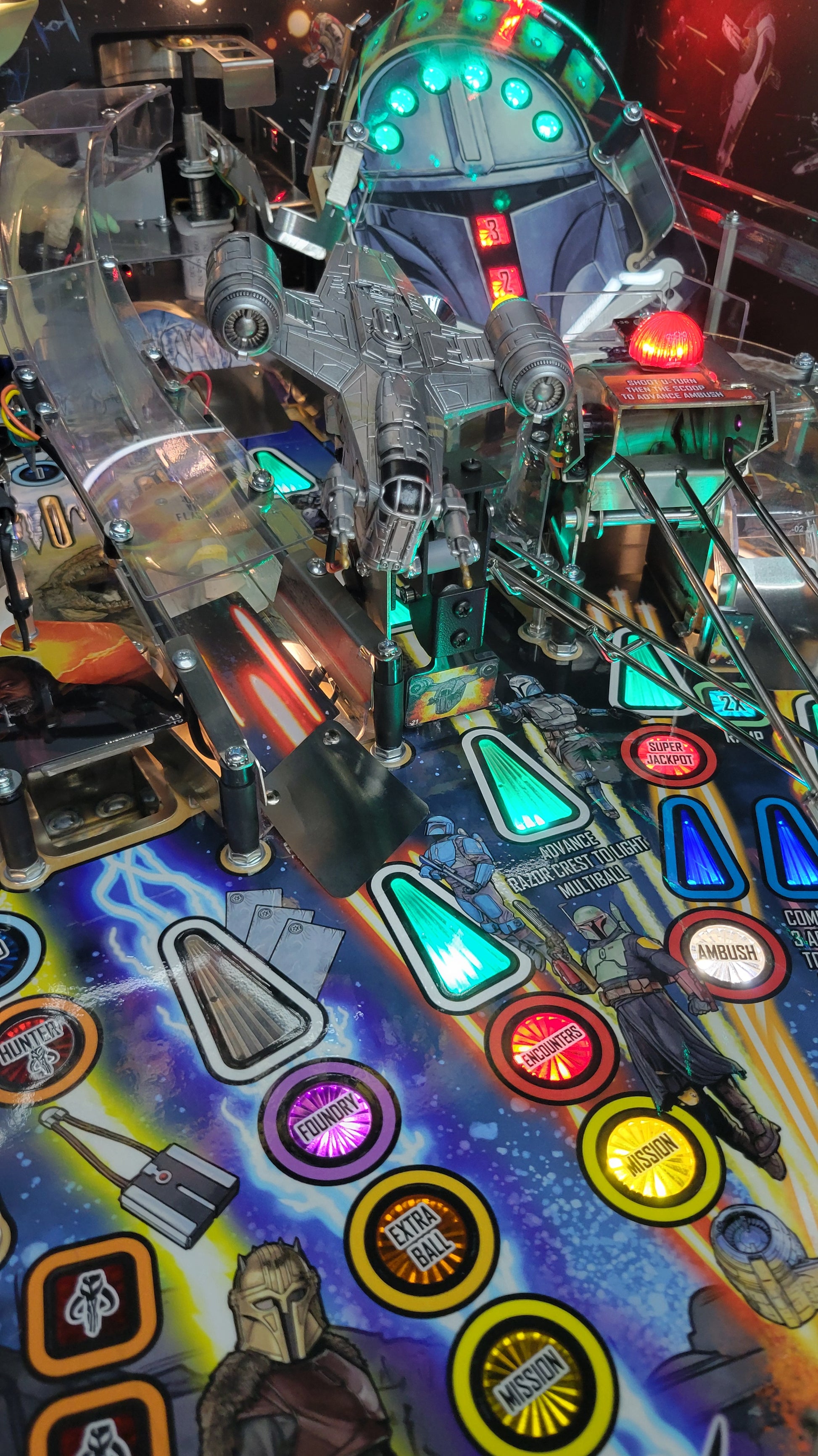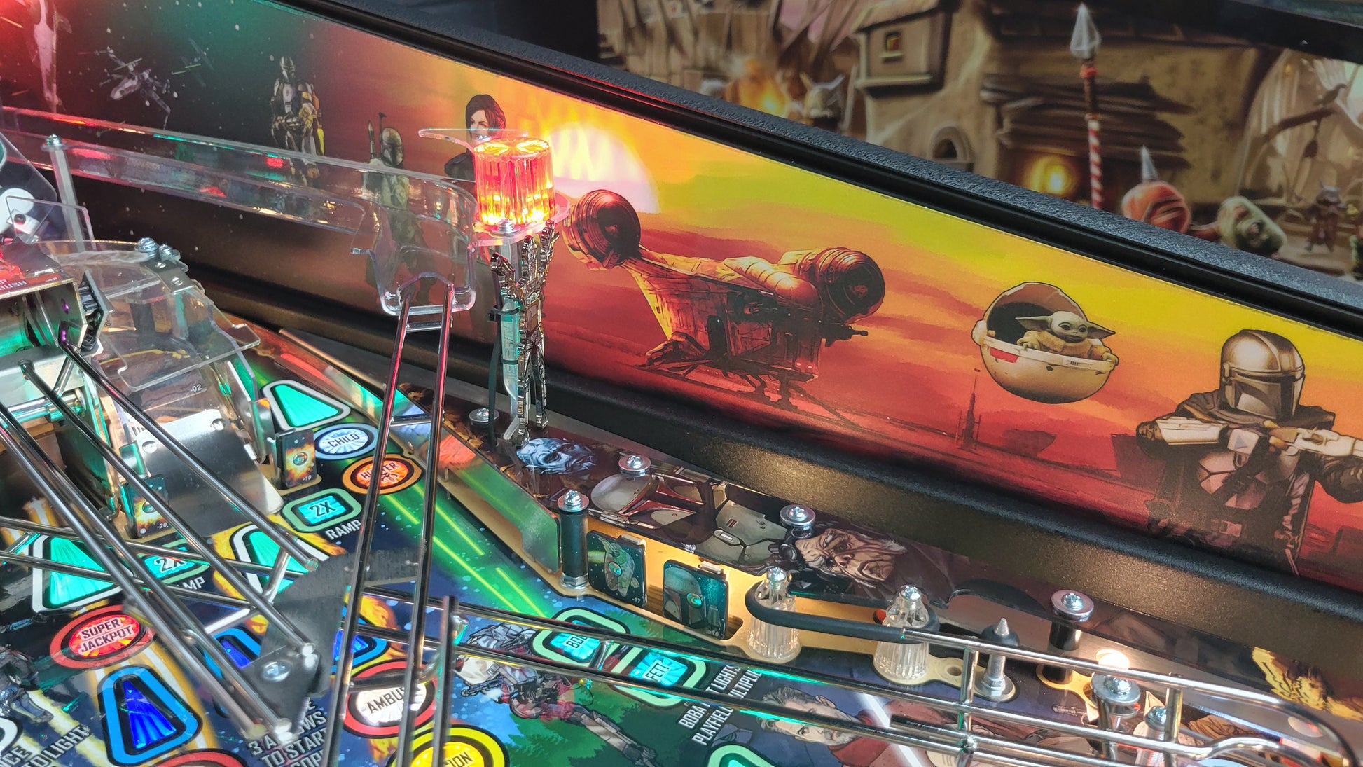 Players can navigate their way to multiball mayhem by hitting a unique hanging uplift target attached to a custom molded Razor Crest ship. Success in hitting the target qualifies a center ramp shot on the Pro, Premium, and Limited Edition models.