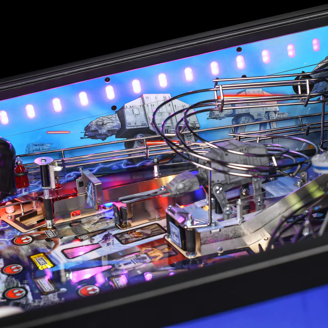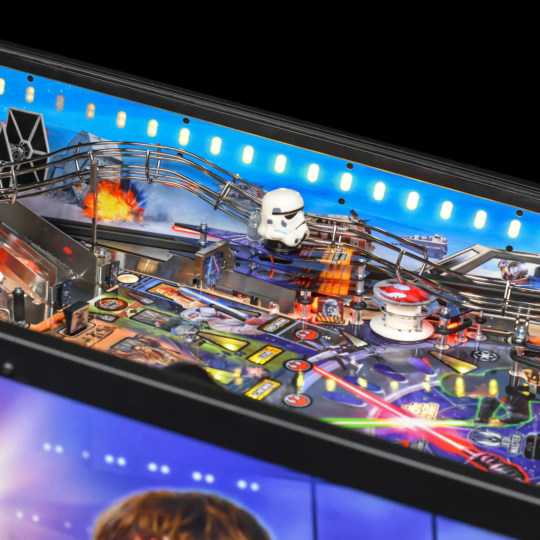 For the Premium Edition, get immersed into the world of Star Wars with the Cabinet Expression Lighting System™ accessory. With 96 intelligent RGB LEDs, the Cabinet Expression Lighting System enables full color spectrum control. Positioned in pockets cut into the cabinet sides to provide themed full playfield illumination, this system is synchronized to custom light shows and dynamically responsive to game events while featuring exclusive Battle of Hoth hand-drawn artwork.