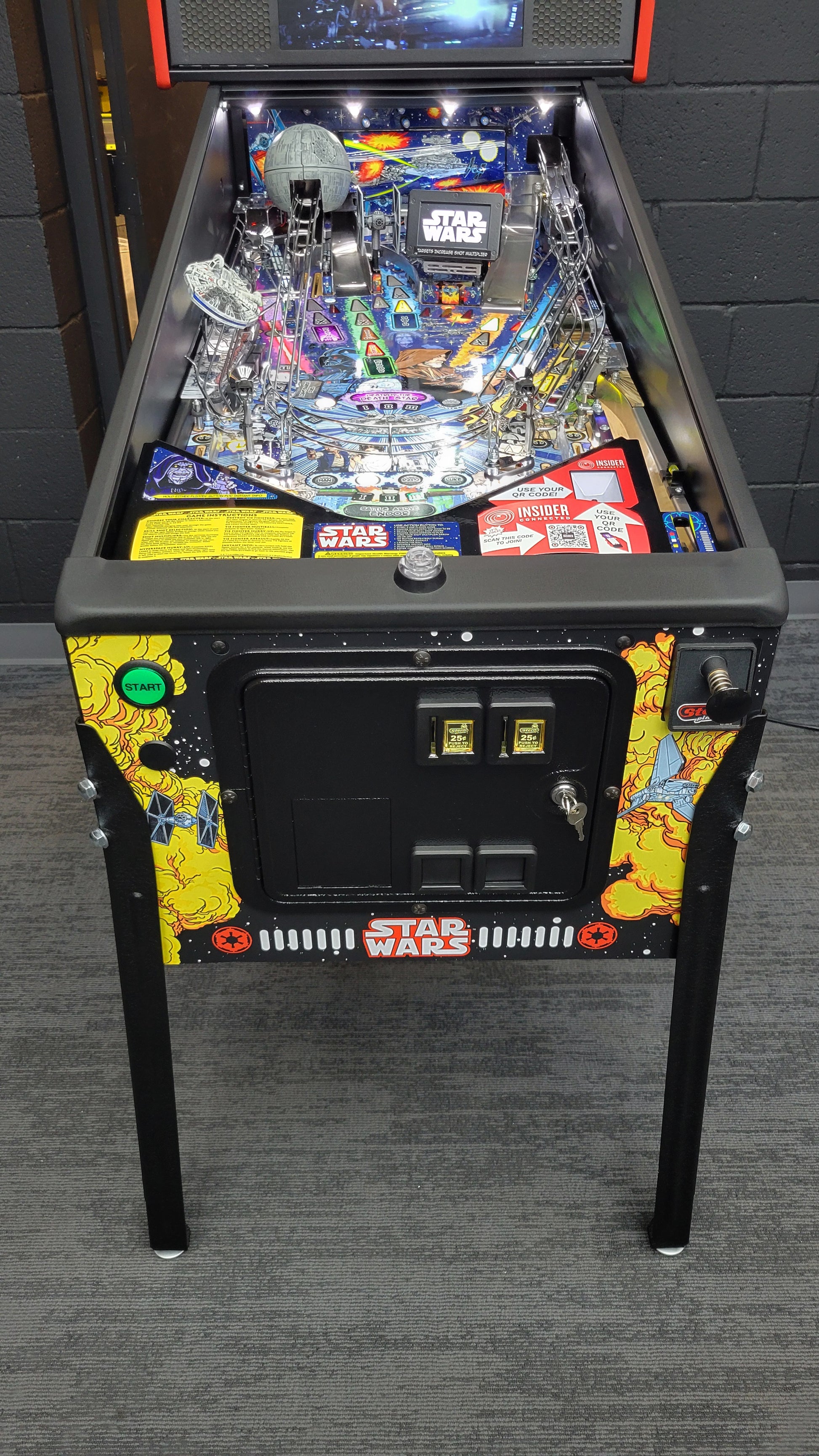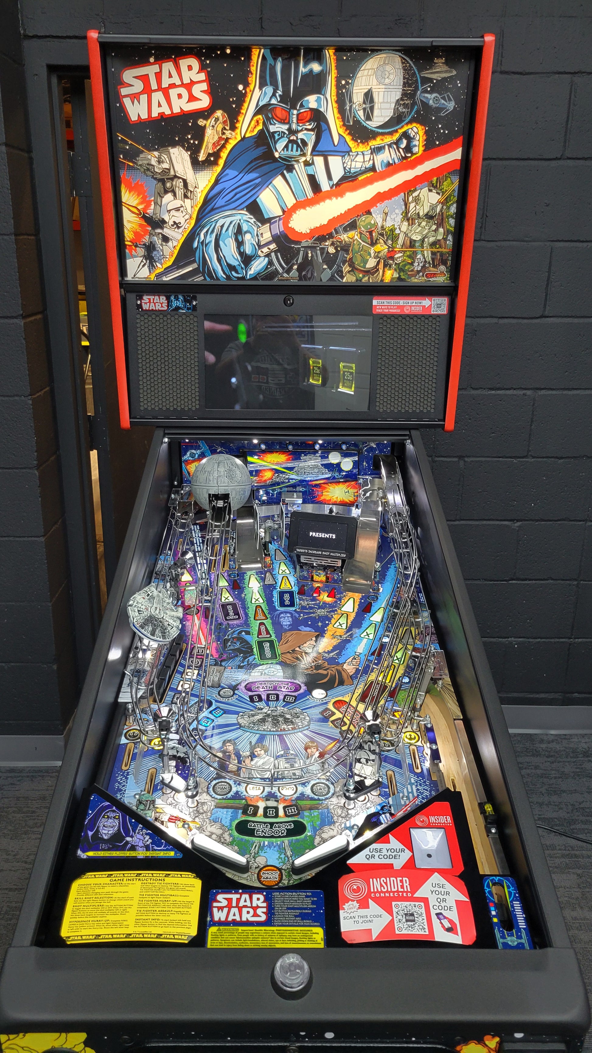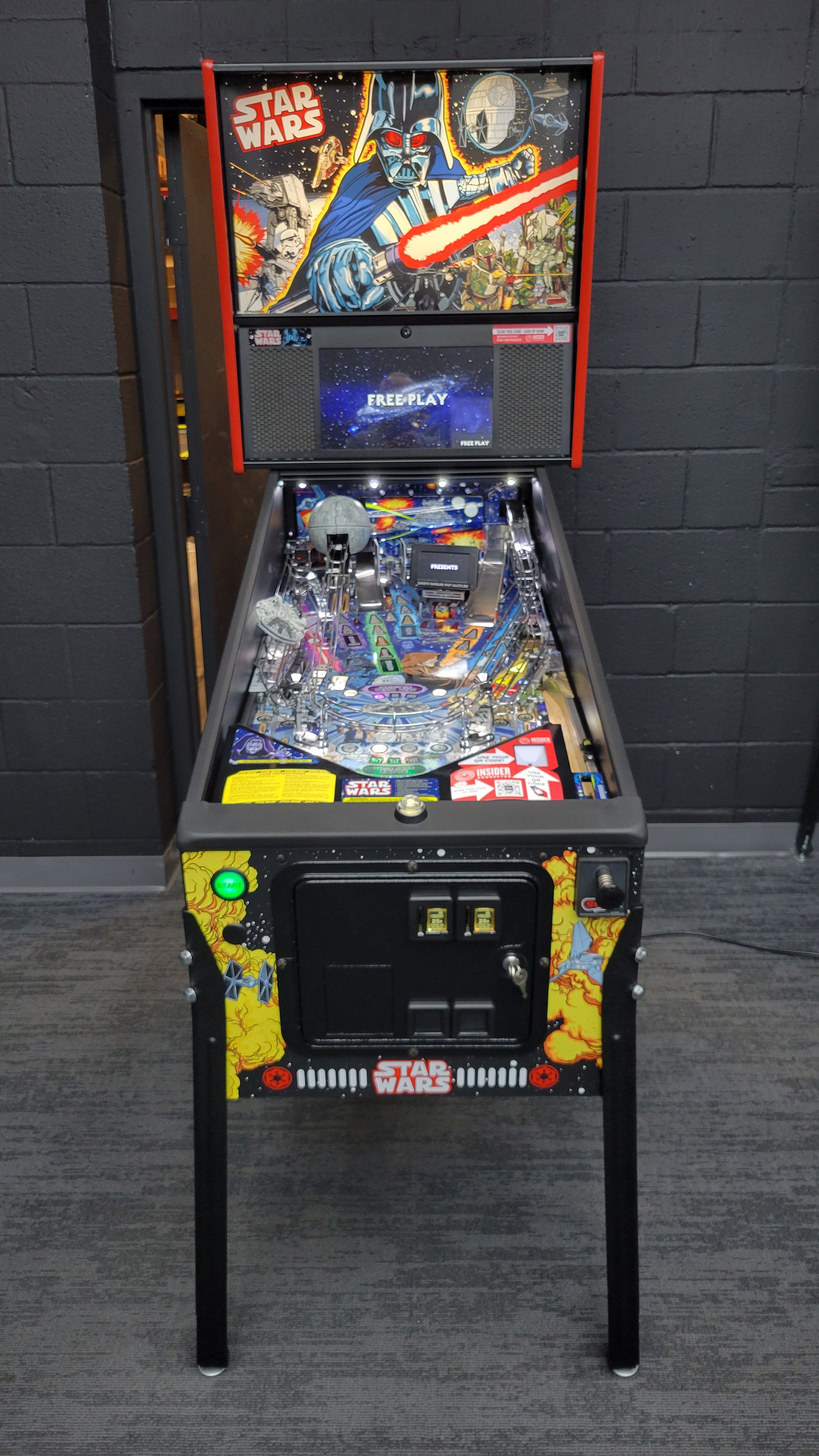 The Star Wars themed Comic Art Pro and Star Wars Comic Art Premium machines made by Stern are packed with features that provide an irresistible game experience. The game includes select dialogue and footage from the original Star Wars trilogy, color-changing LED-lighted inserts, and a sculpted TIE fighter. All models feature two LCD screens. The Premium model also features art representing an exploding Death Star, a sculpted LED-lit Millennium Falcon and an interactive hyperspace loop that encircles the playfield and can accommodate up to 5 pinballs at once.