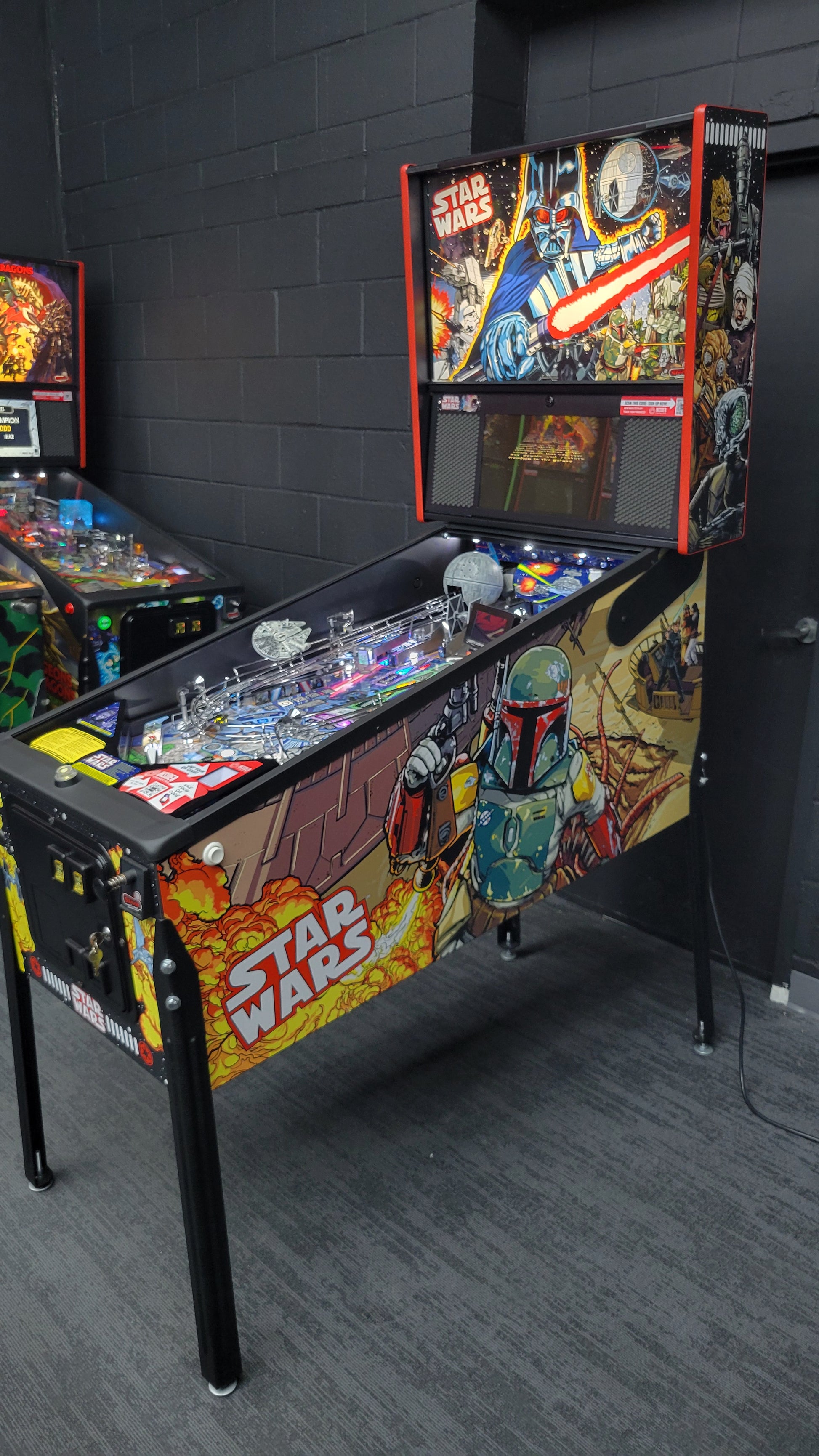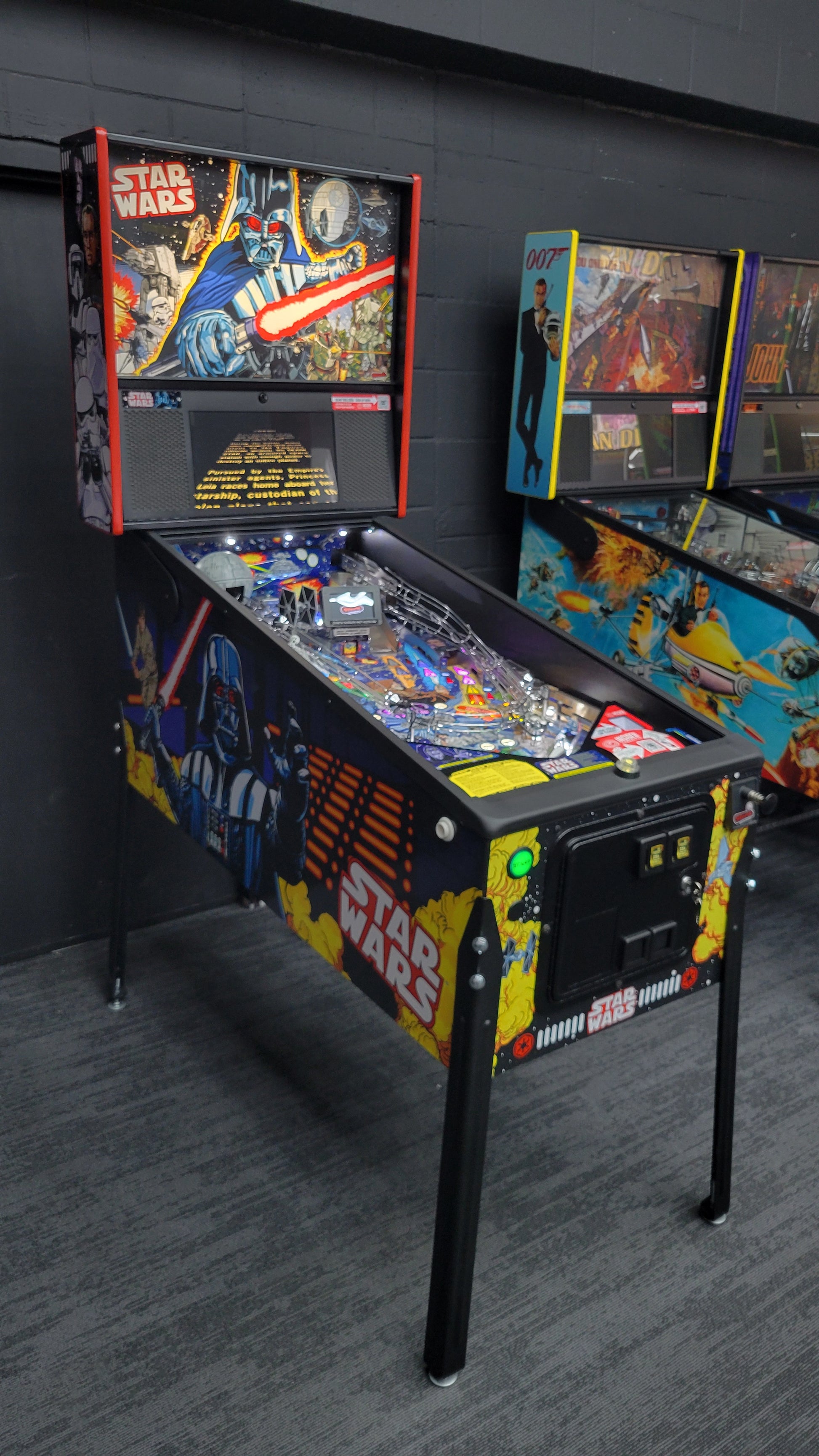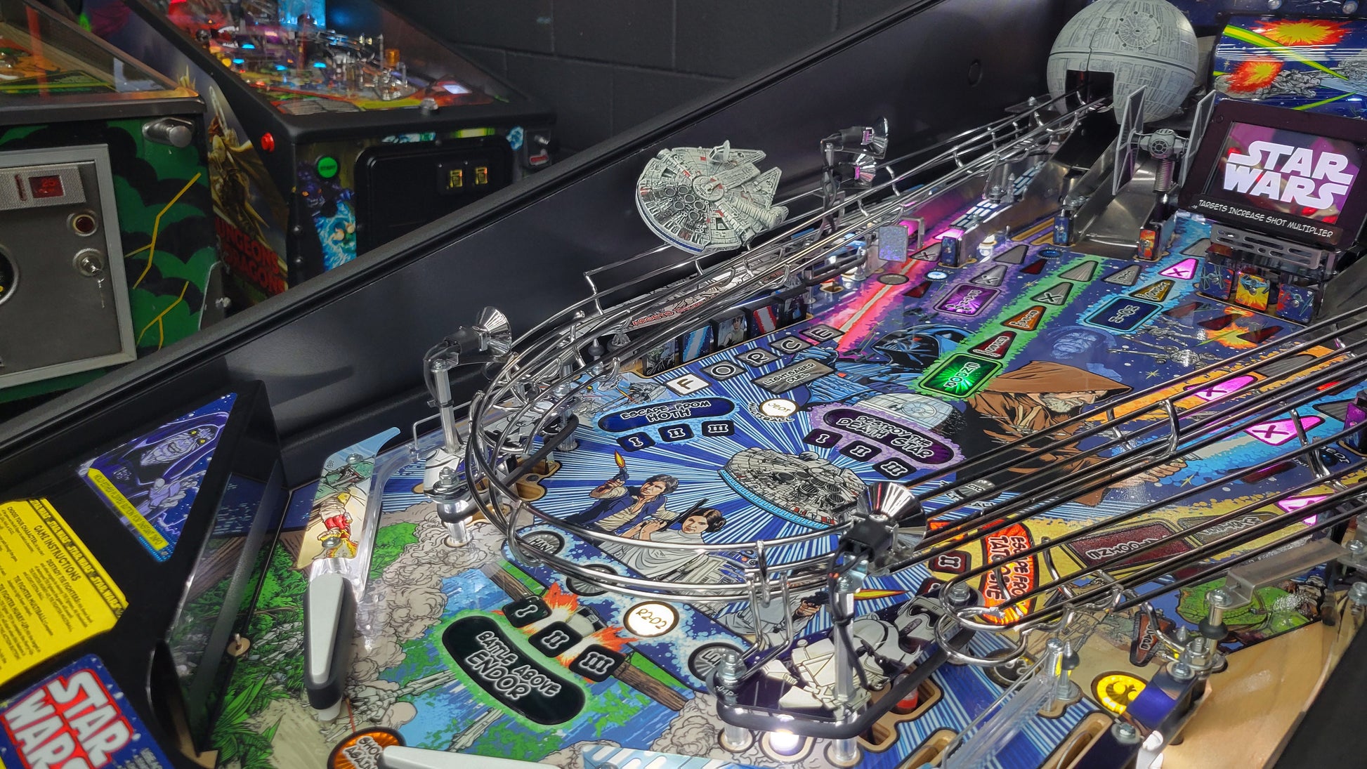 The Star Wars themed Comic Art Pro and Star Wars Comic Art Premium machines made by Stern are packed with features that provide an irresistible game experience. The game includes select dialogue and footage from the original Star Wars trilogy, color-changing LED-lighted inserts, and a sculpted TIE fighter. All models feature two LCD screens. The Premium model also features art representing an exploding Death Star, a sculpted LED-lit Millennium Falcon and an interactive hyperspace loop that encircles the playfield and can accommodate up to 5 pinballs at once.