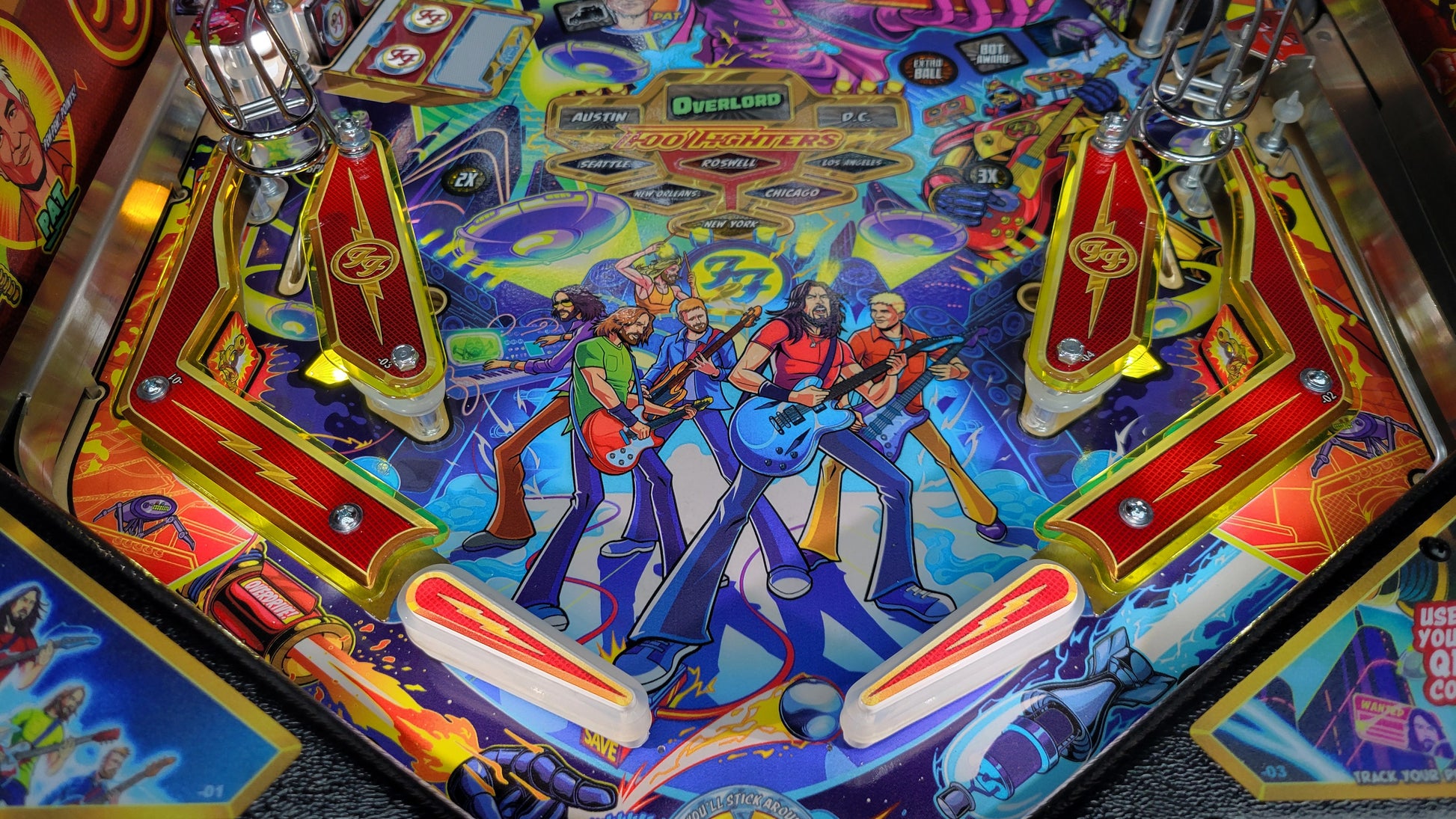 More than two years in the making and with creative input from the band’s own Dave Grohl, Nate Mendel, Pat Smear, Chris Shiflett, Rami Jaffee, and the late, great Taylor Hawkins, Stern’s Foo Fighters is a top-shelf pinball machine—and so much more. An entire new universe has been developed with jaw-dropping hand-drawn artwork and custom animations including “Foo Fighters Saturday Morning Action Time!”—a fictional TV series chronicling the band’s quest to save rock and roll… AND THE WORLD! Join Foo Fighters on this rescue mission to thwart the evil, mysterious alien Overlord and his army of bots. Search the Area 51 upper playfield to break into and unleash pinball chaos. Jump in the van for a righteous tour of duty to save humanity from extinction and let rock rule!