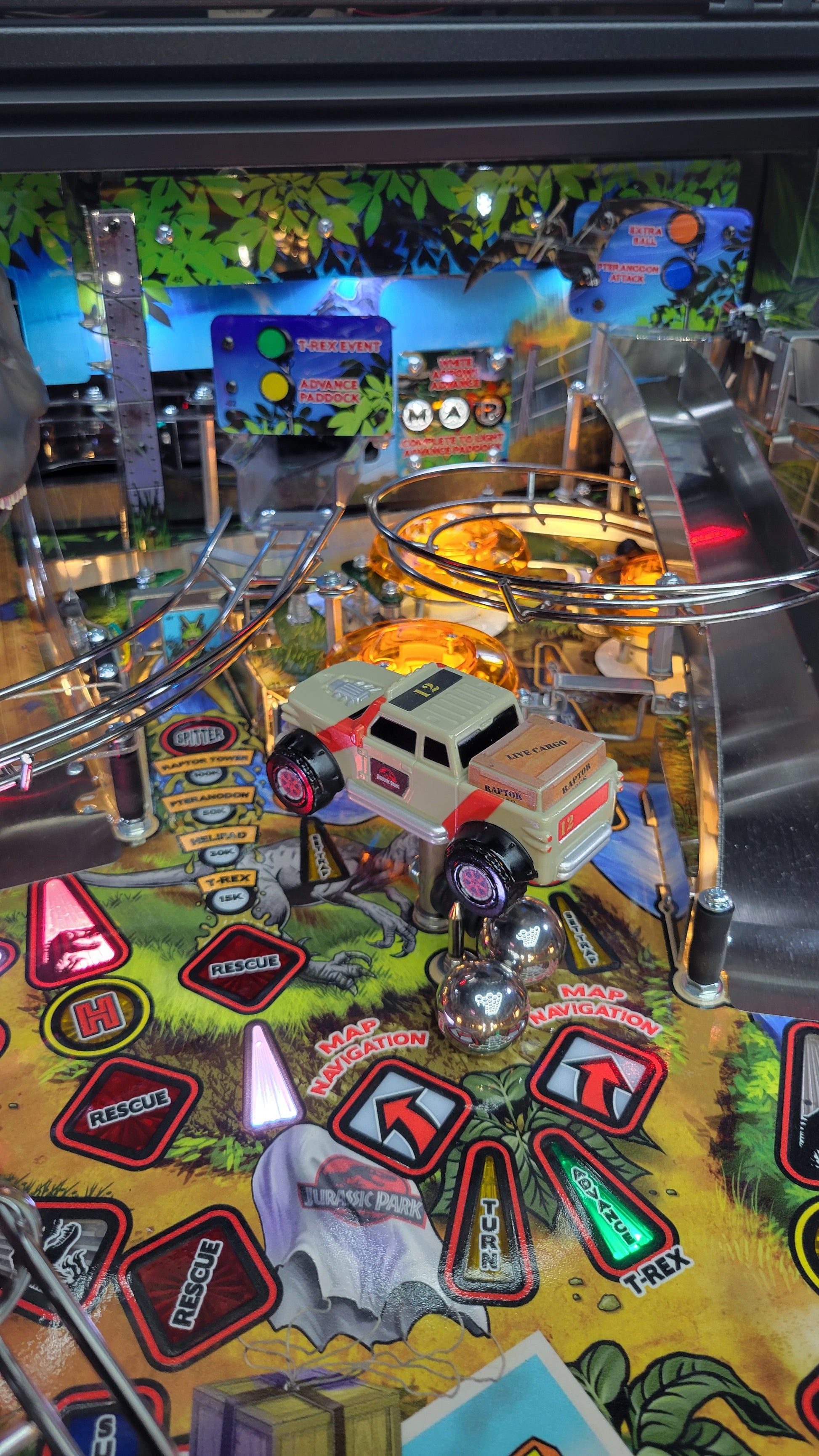 The Pro, Premium, and Limited Edition models also feature a Jungle Adventure Vehicle target in the middle of the playfield that is a spinning Newton Ball. This kinetic target registers direct hits, determines the direction players navigate on the island during gameplay, and lights T. Rex modes. All models include three full sized flippers, four custom ramps, a spinning “Spitter” target, in-lane up/down lock post that sets up critical playfield shots and distinctive hand-drawn art highlighting iconic dinosaurs from the series.
