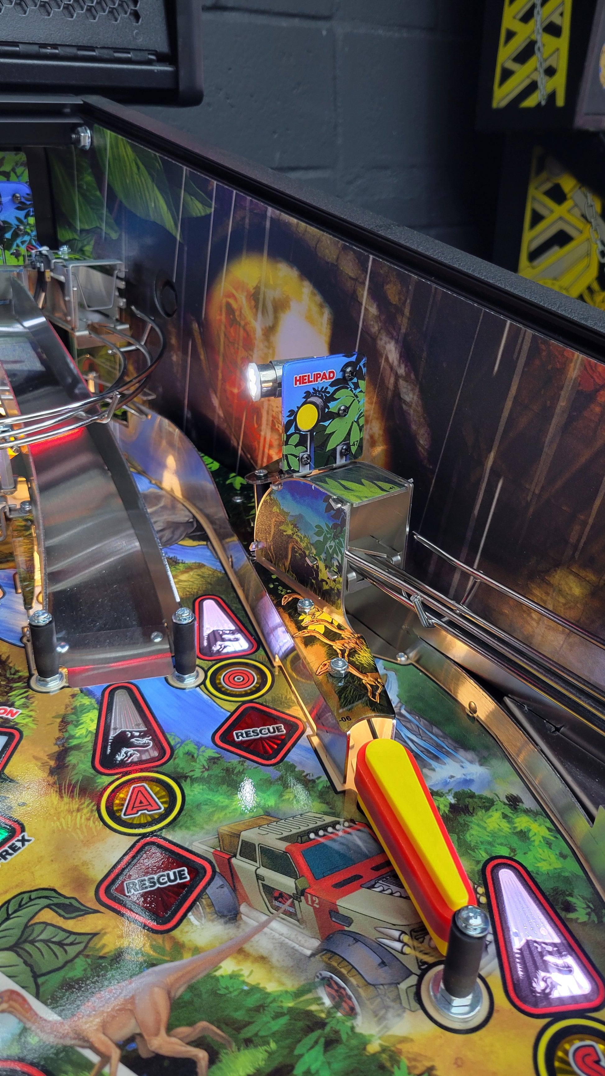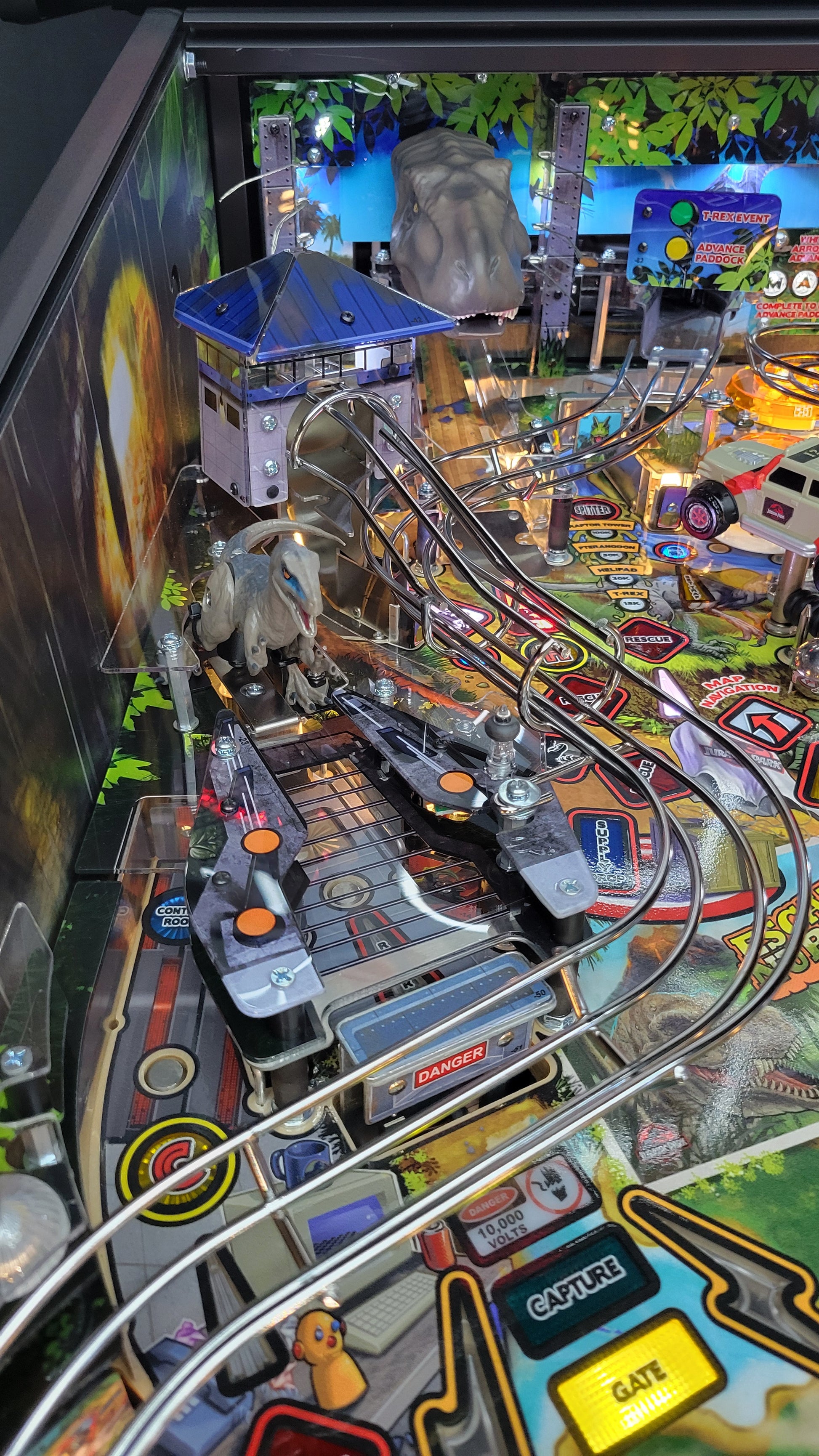 The Premium and Limited Edition models feature an amazing animatronic ball-eating, ball-throwing T. Rex that interacts with the ball and the player. These models also include an interactive Raptor and Raptor Pen featuring a ball-lock mechanism guarded by a motorized gate. The action does not let up with unique mosquito-in-amber pop bumpers and a custom metal horizontal helicopter spinner.